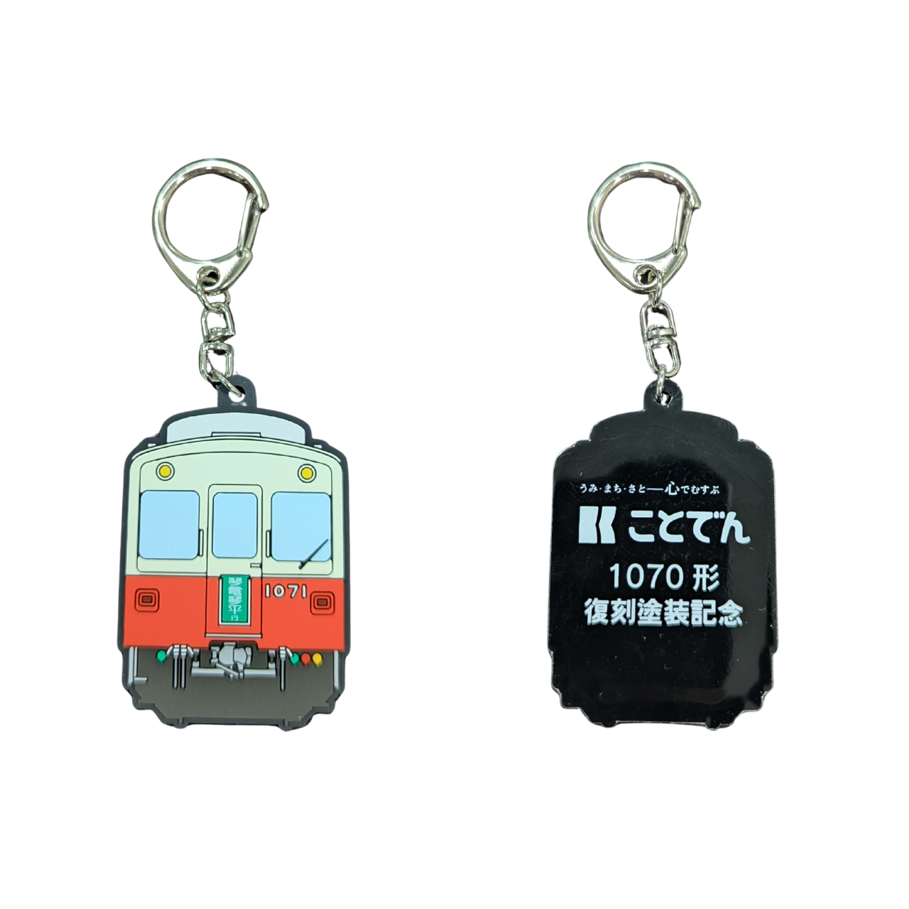 1070形の復刻塗装を施したラバーキーホルダーは、ことでんファンにはたまらないアイテム。